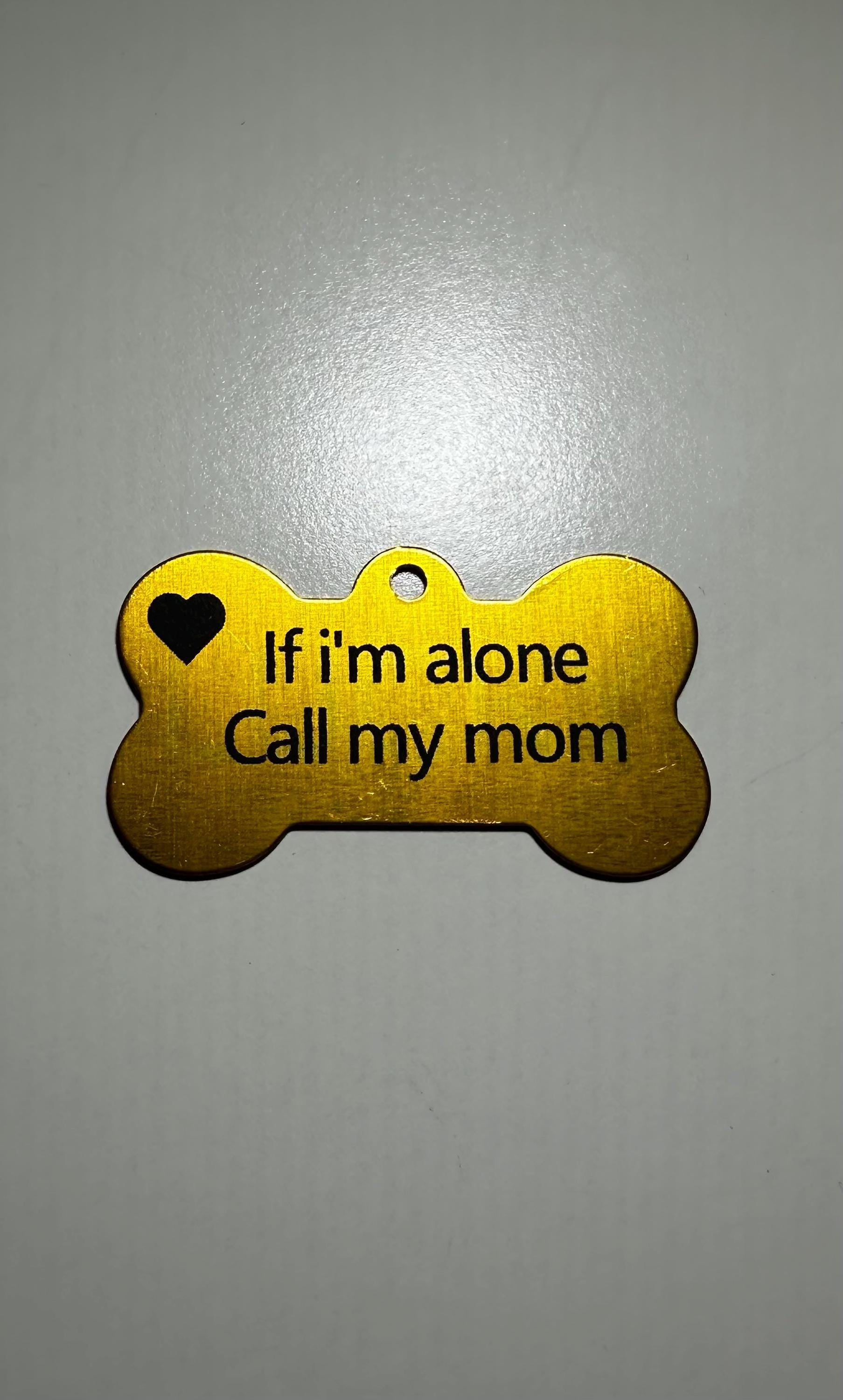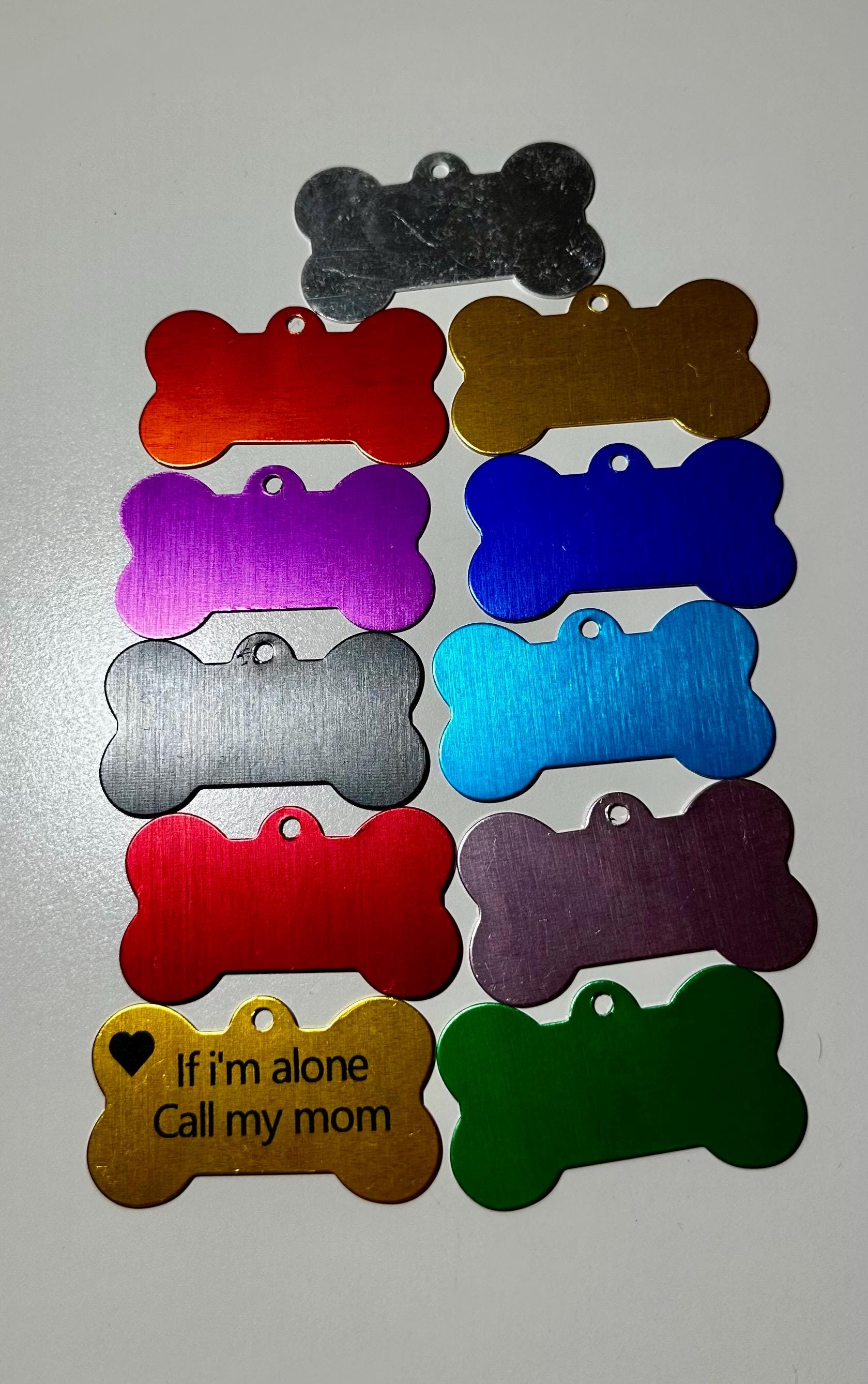 Laser engraved aluminum customizable Pet tags. Choose from an assortment of colors and personalize your pets ID tag. First choose a color and then decide if you would like a background, a border or just a plain tag with just the name. Then choose what you would like engraved on the reverse side for information to get your beloved pet home should you be separated.
